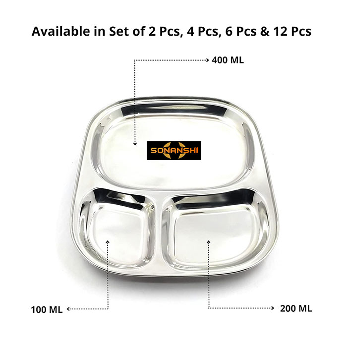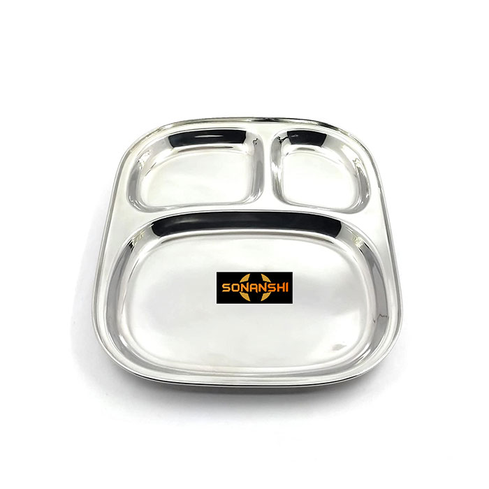Sonanshi Stainless Steel 3 in 1 – Three Compartment Divided Dinner Plate/Pav Bhaji Plate/Partition Thali/Sectioned Plate/Mess Tray